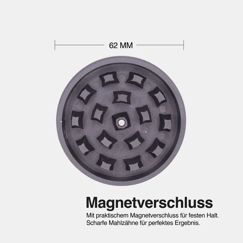 Scharfe Zähne sorgen für gleichmäßiges Zerkleinern deiner Kräuter, während das reduzierte, schwarze Design einen klaren, modernen Look bietet. Ein Grinder für alle, die Wert auf Funktion, Stil und bewussten Konsum legen.