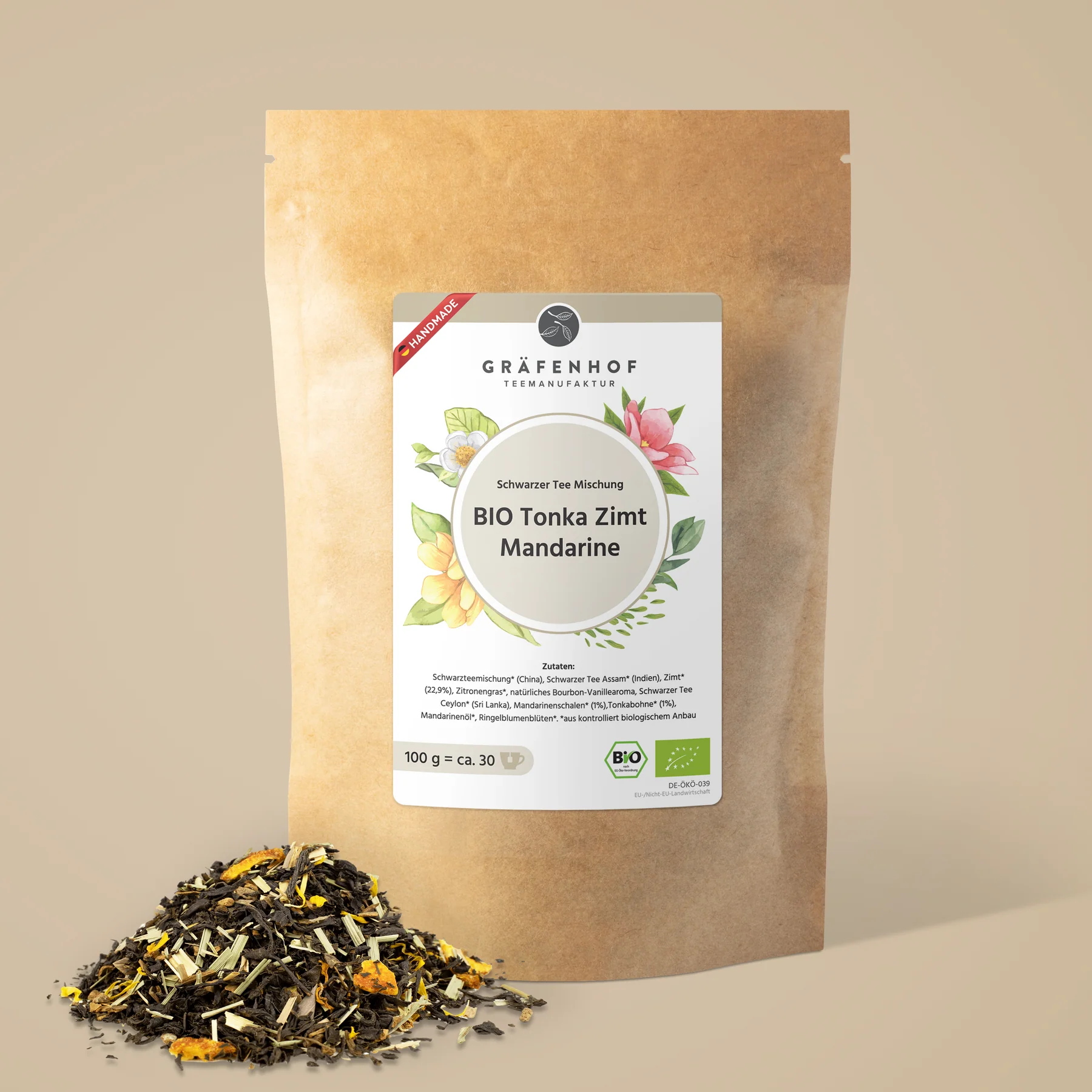 Unser BIO Tonka Zimt Mandarine Tee ist aus kontrolliert biologischem Anbau und trägt das BIO-Siegel. Dies garantiert dir, dass alle Inhaltsstoffe nachhaltig angebaut und sorgfältig verarbeitet wurden, um die höchste Qualität zu gewährleisten.